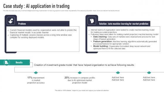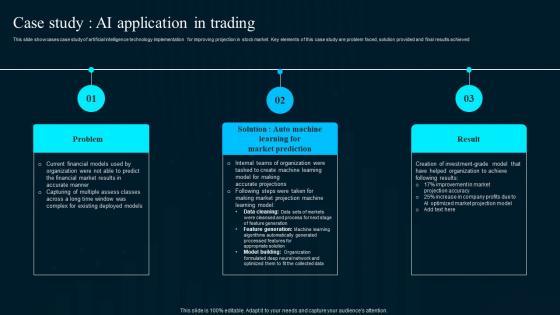 This slide showcases case study of artificial intelligence technology implementation for improving projection in stock market. Key elements of this case study are problem faced, solution provided and final results achieved. Whether you have daily or monthly meetings, a brilliant presentation is necessary. Case Study AI Application In Trading Information Pdf can be your best option for delivering a presentation. Represent everything in detail using Case Study AI Application In Trading Information Pdf and make yourself stand out in meetings. The template is versatile and follows a structure that will cater to your requirements. All the templates prepared by Slidegeeks are easy to download and edit. Our research experts have taken care of the corporate themes as well. So, give it a try and see the results. This slide showcases case study of artificial intelligence technology implementation for improving projection in stock market. Key elements of this case study are problem faced, solution provided and final results achieved.