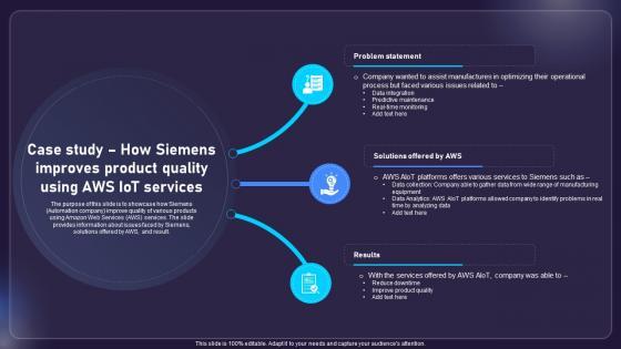 The purpose of this slide is to showcase how Siemens Automation company improve quality of various products using Amazon Web Services AWS services. The slide provides information about issues faced by Siemens, solutions offered by AWS, and result. Whether you have daily or monthly meetings, a brilliant presentation is necessary. Case Study How Siemens Improves Product Quality AIOT Applications For Various Industries IoT SS V can be your best option for delivering a presentation. Represent everything in detail using Case Study How Siemens Improves Product Quality AIOT Applications For Various Industries IoT SS V and make yourself stand out in meetings. The template is versatile and follows a structure that will cater to your requirements. All the templates prepared by Slidegeeks are easy to download and edit. Our research experts have taken care of the corporate themes as well. So, give it a try and see the results. The purpose of this slide is to showcase how Siemens Automation company improve quality of various products using Amazon Web Services AWS services. The slide provides information about issues faced by Siemens, solutions offered by AWS, and result.