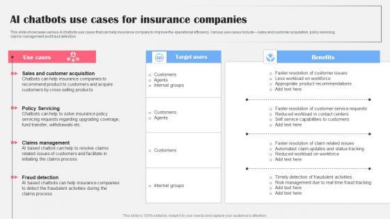 This slide showcases various AI chatbots use cases that can help insurance company to improve the operational efficiency. Various use cases include sales and customer acquisition, policy servicing, claims management and fraud detection Slidegeeks is here to make your presentations a breeze with AI Chatbots Use Cases For Insurance AI Bot Application For Various Industries Mockup Pdf With our easy to use and customizable templates, you can focus on delivering your ideas rather than worrying about formatting. With a variety of designs to choose from, you are sure to find one that suits your needs. And with animations and unique photos, illustrations, and fonts, you can make your presentation pop. So whether you are giving a sales pitch or presenting to the board, make sure to check out Slidegeeks first This slide showcases various AI chatbots use cases that can help insurance company to improve the operational efficiency. Various use cases include sales and customer acquisition, policy servicing, claims management and fraud detection
