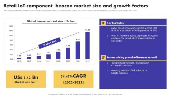 The following slide highlights the global market size and forecasted growth along with revenue CAGR for IoT component beacon. It also shows key highlights and growth drivers in IoT retail. Presenting this PowerPoint presentation, titled IoT Application In Global Retail IoT Component Beacon Market Size And Growth Background Pdf with topics curated by our researchers after extensive research. This editable presentation is available for immediate download and provides attractive features when used. Download now and captivate your audience. Presenting this IoT Application In Global Retail IoT Component Beacon Market Size And Growth Background Pdf Our researchers have carefully researched and created these slides with all aspects taken into consideration. This is a completely customizable IoT Application In Global Retail IoT Component Beacon Market Size And Growth Background Pdf that is available for immediate downloading. Download now and make an impact on your audience. Highlight the attractive features available with our PPTs. The following slide highlights the global market size and forecasted growth along with revenue CAGR for IoT component beacon. It also shows key highlights and growth drivers in IoT retail