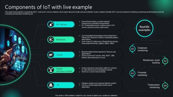 This slide showcases the components of IoT, such as IoT sensor, network, cloud, hyper-decision model, and user interface. It also contains benefits of IoT such as employee monitoring, warehouse asset tracking, proximity marketing, temperature monitoring, etc. If your project calls for a presentation, then Slidegeeks is your go-to partner because we have professionally designed, easy-to-edit templates that are perfect for any presentation. After downloading, you can easily edit Unlocking Potential IoTs Application Components Of IoT With Live Example IoT SS V and make the changes accordingly. You can rearrange slides or fill them with different images. Check out all the handy templates This slide showcases the components of IoT, such as IoT sensor, network, cloud, hyper-decision model, and user interface. It also contains benefits of IoT such as employee monitoring, warehouse asset tracking, proximity marketing, temperature monitoring, etc.