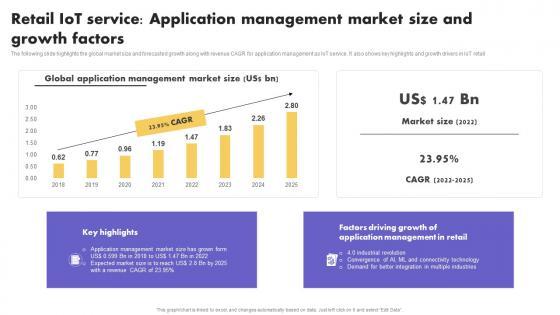 The following slide highlights the global market size and forecasted growth along with revenue CAGR for application management as IoT service. It also shows key highlights and growth drivers in IoT retail. Whether you have daily or monthly meetings, a brilliant presentation is necessary. Retail Iot Service Application Management Market Size And Growth Factors Introduction PDF can be your best option for delivering a presentation. Represent everything in detail using Retail Iot Service Application Management Market Size And Growth Factors Introduction PDF and make yourself stand out in meetings. The template is versatile and follows a structure that will cater to your requirements. All the templates prepared by Slidegeeks are easy to download and edit. Our research experts have taken care of the corporate themes as well. So, give it a try and see the results.
