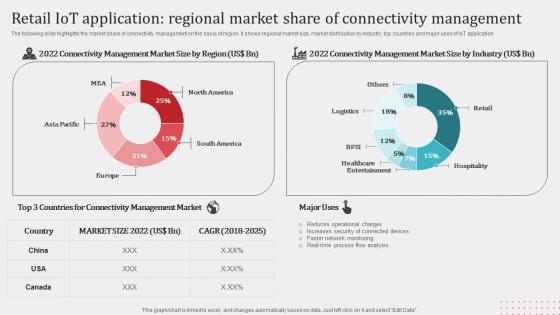 The following slide highlights the market share of connectivity management on the basis of region. It shows regional market size, market distribution by industry, top countries and major uses of IoT application This Retail IoT Application Regional Market Share Of Connectivity Management Mockup Pdf from Slidegeeks makes it easy to present information on your topic with precision. It provides customization options, so you can make changes to the colors, design, graphics, or any other component to create a unique layout. It is also available for immediate download, so you can begin using it right away. Slidegeeks has done good research to ensure that you have everything you need to make your presentation stand out. Make a name out there for a brilliant performance. The following slide highlights the market share of connectivity management on the basis of region. It shows regional market size, market distribution by industry, top countries and major uses of IoT application