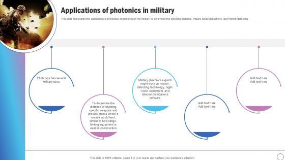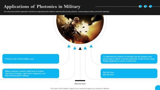 This slide represents the application of photonics engineering in the military to determine the shooting distance, missile landing locations, and motion detecting. Slidegeeks is here to make your presentations a breeze with Fibers IT Applications Of Photonics In Military With our easy-to-use and customizable templates, you can focus on delivering your ideas rather than worrying about formatting. With a variety of designs to choose from, you are sure to find one that suits your needs. And with animations and unique photos, illustrations, and fonts, you can make your presentation pop. So whether you are giving a sales pitch or presenting to the board, make sure to check out Slidegeeks first This slide represents the application of photonics engineering in the military to determine the shooting distance, missile landing locations, and motion detecting.