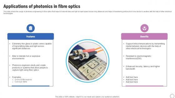 This slide shows the usage of photonics engineering in fibre optics that helps to transmit data and light at rapid speed across long distances and helps in transferring pictures from one device to another with the help of other electrical technologies. From laying roadmaps to briefing everything in detail, our templates are perfect for you. You can set the stage with your presentation slides. All you have to do is download these easy-to-edit and customizable templates. Fibers IT Applications Of Photonics In Fibre Optics will help you deliver an outstanding performance that everyone would remember and praise you for. Do download this presentation today. This slide shows the usage of photonics engineering in fibre optics that helps to transmit data and light at rapid speed across long distances and helps in transferring pictures from one device to another with the help of other electrical technologies.