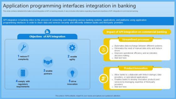 This slide contains detailed information about integration of API in banking industry. It also includes information regarding impact and objectives of API integration in commercial banking. There are so many reasons you need a Application Programming Interfaces Integration Complete Guide On Managing Banking Fin SS V. The first reason is you can not spend time making everything from scratch, Thus, Slidegeeks has made presentation templates for you too. You can easily download these templates from our website easily. This slide contains detailed information about integration of API in banking industry. It also includes information regarding impact and objectives of API integration in commercial banking.