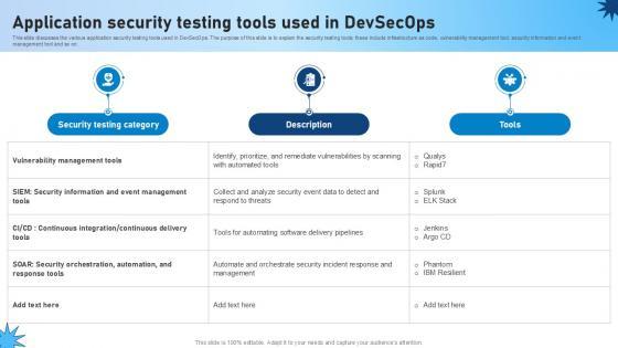 This slide discusses the various application security testing tools used in DevSecOps. The purpose of this slide is to explain the security testing tools these include static application security testing, software composition analysis, interactive application security testing, etc. Find a pre-designed and impeccable Application Security Testing Tools Used In Devsecops Role Of Devsecops Ppt Sample The templates can ace your presentation without additional effort. You can download these easy-to-edit presentation templates to make your presentation stand out from others. So, what are you waiting for Download the template from Slidegeeks today and give a unique touch to your presentation. This slide discusses the various application security testing tools used in DevSecOps. The purpose of this slide is to explain the security testing tools these include static application security testing, software composition analysis, interactive application security testing, etc.