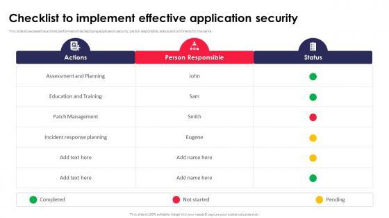 This slide showcases the actions performed while deploying application security, person responsible, status and comments for the same. If you are looking for a format to display your unique thoughts, then the professionally designed Checklist To Implement Effective Application Security Application Security Testing is the one for you. You can use it as a Google Slides template or a PowerPoint template. Incorporate impressive visuals, symbols, images, and other charts. Modify or reorganize the text boxes as you desire. Experiment with shade schemes and font pairings. Alter, share or cooperate with other people on your work. Download Checklist To Implement Effective Application Security Application Security Testing and find out how to give a successful presentation. Present a perfect display to your team and make your presentation unforgettable. This slide showcases the actions performed while deploying application security, person responsible, status and comments for the same.