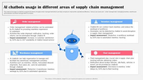 This slide showcases Ai chatbots usage for functions of supply chain management which can help company to improve the operational efficiency. Various use cases are order management, managing inventory, warehouse administration and fleet management of company Present like a pro with AI Chatbots Usage In Different Areas Supply AI Bot Application For Various Industries Icons Pdf Create beautiful presentations together with your team, using our easy to use presentation slides. Share your ideas in real time and make changes on the fly by downloading our templates. So whether you are in the office, on the go, or in a remote location, you can stay in sync with your team and present your ideas with confidence. With Slidegeeks presentation got a whole lot easier. Grab these presentations today. This slide showcases Ai chatbots usage for functions of supply chain management which can help company to improve the operational efficiency. Various use cases are order management, managing inventory, warehouse administration and fleet management of company