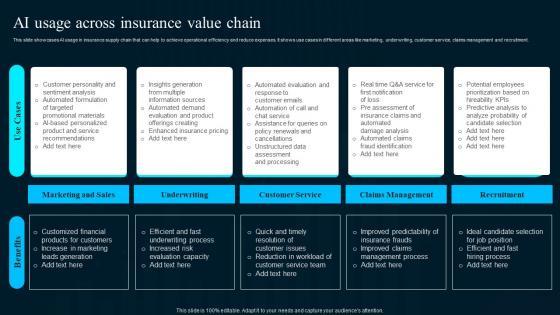 This slide showcases AI usage in insurance supply chain that can help to achieve operational efficiency and reduce expenses. It shows use cases in different areas like marketing, underwriting, customer service, claims management and recruitment.Explore a selection of the finest Ai Usage Across Insurance Value Chain Artificial Intelligence Applications Pictures Pdf here. With a plethora of professionally designed and pre-made slide templates, you can quickly and easily find the right one for your upcoming presentation. You can use our Ai Usage Across Insurance Value Chain Artificial Intelligence Applications Pictures Pdf to effectively convey your message to a wider audience. Slidegeeks has done a lot of research before preparing these presentation templates. The content can be personalized and the slides are highly editable. Grab templates today from Slidegeeks. This slide showcases AI usage in insurance supply chain that can help to achieve operational efficiency and reduce expenses. It shows use cases in different areas like marketing, underwriting, customer service, claims management and recruitment.