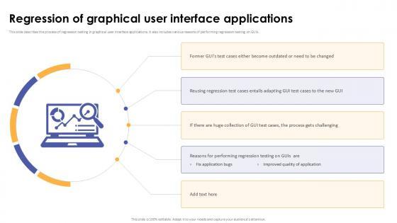 This slide describes the process of regression testing in graphical user interface applications. It also includes various reasons of performing regression testing on GUIs. Whether you have daily or monthly meetings, a brilliant presentation is necessary. Regression Of Graphical User Interface Applications Corrective Regression Testing Ppt Slide can be your best option for delivering a presentation. Represent everything in detail using Regression Of Graphical User Interface Applications Corrective Regression Testing Ppt Slide and make yourself stand out in meetings. The template is versatile and follows a structure that will cater to your requirements. All the templates prepared by Slidegeeks are easy to download and edit. Our research experts have taken care of the corporate themes as well. So, give it a try and see the results. This slide describes the process of regression testing in graphical user interface applications. It also includes various reasons of performing regression testing on GUIs.
