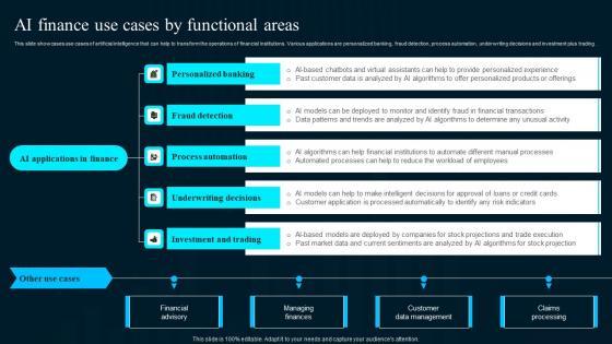 This slide showcases use cases of artificial intelligence that can help to transform the operations of financial institutions. Various applications are personalized banking, fraud detection, process automation, underwriting decisions and investment plus trading.Present like a pro with Ai Finance Use Cases By Functional Areas Artificial Intelligence Applications Elements Pdf Create beautiful presentations together with your team, using our easy-to-use presentation slides. Share your ideas in real-time and make changes on the fly by downloading our templates. So whether you are in the office, on the go, or in a remote location, you can stay in sync with your team and present your ideas with confidence. With Slidegeeks presentation got a whole lot easier. Grab these presentations today. This slide showcases use cases of artificial intelligence that can help to transform the operations of financial institutions. Various applications are personalized banking, fraud detection, process automation, underwriting decisions and investment plus trading .