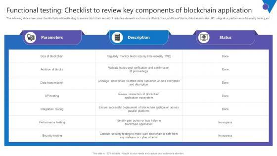 The following slide showcases checklist for functional testing to ensure blockchain security. It includes elements such as size of blockchain, addition of blocks, data transmission, API, integration, performance and security testing, etc. Do you have to make sure that everyone on your team knows about any specific topic I yes, then you should give Functional Testing Checklist To Review Key Components Of Blockchain Application Topics Pdf a try. Our experts have put a lot of knowledge and effort into creating this impeccable Functional Testing Checklist To Review Key Components Of Blockchain Application Topics Pdf. You can use this template for your upcoming presentations, as the slides are perfect to represent even the tiniest detail. You can download these templates from the Slidegeeks website and these are easy to edit. So grab these today The following slide showcases checklist for functional testing to ensure blockchain security. It includes elements such as size of blockchain, addition of blocks, data transmission, API, integration, performance and security testing, etc.
