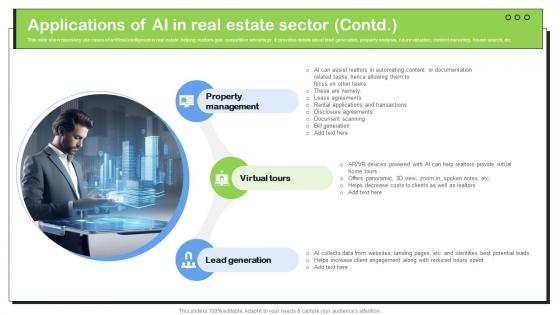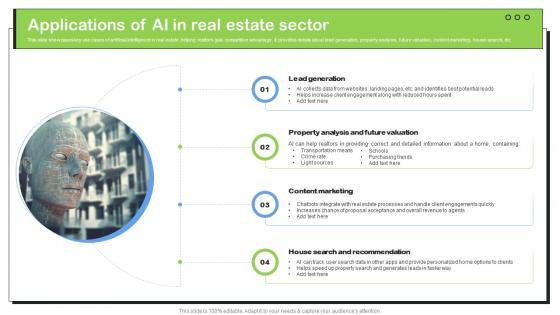 This slide showcases key use cases of artificial intelligence in real estate, helping realtors gain competitive advantage. It provides details about lead generation, property analysis, future valuation, content marketing, house search, etc. There are so many reasons you need a Transforming Real Estate Applications Of AI In Real Estate Sector ChatGPT SS V. The first reason is you can not spend time making everything from scratch, Thus, Slidegeeks has made presentation templates for you too. You can easily download these templates from our website easily. This slide showcases key use cases of artificial intelligence in real estate, helping realtors gain competitive advantage. It provides details about lead generation, property analysis, future valuation, content marketing, house search, etc.