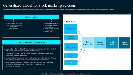 This slide showcases model that can help institutional investors to predict and make investments in market. Its key elements are technical indicators, data preprocessing, feature extraction, AIorML models and model evaluation.Make sure to capture your audiences attention in your business displays with our gratis customizable Generalized Model For Stock Market Artificial Intelligence Applications Demonstration Pdf. These are great for business strategies, office conferences, capital raising or task suggestions. If you desire to acquire more customers for your tech business and ensure they stay satisfied, create your own sales presentation with these plain slides. This slide showcases model that can help institutional investors to predict and make investments in market. Its key elements are technical indicators, data preprocessing, feature extraction, AIorML models and model evaluation.