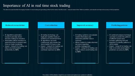 This slide showcase benefits of leveraging AI solution for stock trading and generating profits from the market. Benefits include reduced research time. Patterns prediction, cost reduction and improved accuracy of stock projections.Explore a selection of the finest Importance Of Ai In Real Time Stock Trading Artificial Intelligence Applications Themes Pdf here. With a plethora of professionally designed and pre-made slide templates, you can quickly and easily find the right one for your upcoming presentation. You can use our Importance Of Ai In Real Time Stock Trading Artificial Intelligence Applications Themes Pdf to effectively convey your message to a wider audience. Slidegeeks has done a lot of research before preparing these presentation templates. The content can be personalized and the slides are highly editable. Grab templates today from Slidegeeks. This slide showcase benefits of leveraging AI solution for stock trading and generating profits from the market. Benefits include reduced research time. Patterns prediction, cost reduction and improved accuracy of stock projections.