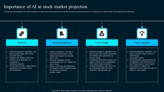 This slide showcases benefits of leveraging AI solutions for making stock market projections. Key benefits of using AI for market projections are increase accuracy, faster analysis, risk management and cost savings.The best PPT templates are a great way to save time, energy, and resources. Slidegeeks have 100Precent editable powerpoint slides making them incredibly versatile. With these quality presentation templates, you can create a captivating and memorable presentation by combining visually appealing slides and effectively communicating your message. Download Importance Of Ai In Stock Market Projection Artificial Intelligence Applications Elements Pdf from Slidegeeks and deliver a wonderful presentation. This slide showcases benefits of leveraging AI solutions for making stock market projections. Key benefits of using AI for market projections are increase accuracy, faster analysis, risk management and cost savings.