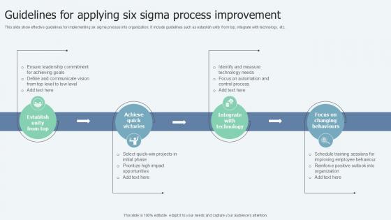 This slide show effective guidelines for implementing six sigma process into organization. It include guidelines such as establish unity from top, integrate with technology, etc. If you are looking for a format to display your unique thoughts, then the professionally designed Guidelines For Applying Lean Six Sigma In Manufacturing Ppt Template is the one for you. You can use it as a Google Slides template or a PowerPoint template. Incorporate impressive visuals, symbols, images, and other charts. Modify or reorganize the text boxes as you desire. Experiment with shade schemes and font pairings. Alter, share or cooperate with other people on your work. Download Guidelines For Applying Lean Six Sigma In Manufacturing Ppt Template and find out how to give a successful presentation. Present a perfect display to your team and make your presentation unforgettable. This slide show effective guidelines for implementing six sigma process into organization. It include guidelines such as establish unity from top, integrate with technology, etc.