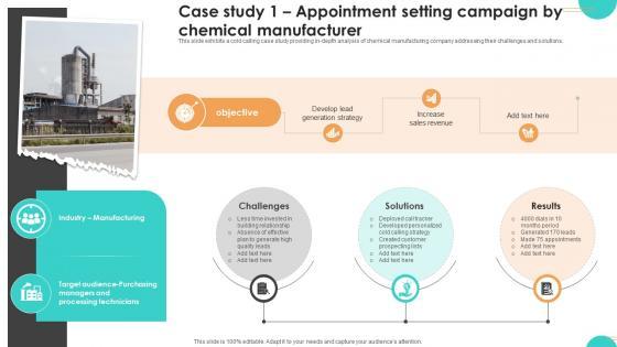 This slide exhibits a cold calling case study providing in-depth analysis of chemical manufacturing company addressing their challenges and solutions. Whether you have daily or monthly meetings, a brilliant presentation is necessary. Ultimate Guide To Cold Case Study 1 Appointment Setting Campaign SA SS V can be your best option for delivering a presentation. Represent everything in detail using Ultimate Guide To Cold Case Study 1 Appointment Setting Campaign SA SS V and make yourself stand out in meetings. The template is versatile and follows a structure that will cater to your requirements. All the templates prepared by Slidegeeks are easy to download and edit. Our research experts have taken care of the corporate themes as well. So, give it a try and see the results. This slide exhibits a cold calling case study providing in-depth analysis of chemical manufacturing company addressing their challenges and solutions.