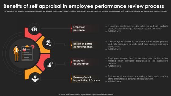 Get a simple yet stunning designed Benefits Of Self Appraisal In Employee Performance Review Process. It is the best one to establish the tone in your meetings. It is an excellent way to make your presentations highly effective. So, download this PPT today from Slidegeeks and see the positive impacts. Our easy-to-edit Benefits Of Self Appraisal In Employee Performance Review Process can be your go-to option for all upcoming conferences and meetings. So, what are you waiting for Grab this template today. Our Benefits of Self-Appraisal in Employee Performance Review Process templates are designed as professional and an eye-catching support for any dialogue. These provide an example through which self-appraisal helps reflect on achievements that have been scored, areas that must be improved on, and personal goals or objectives. Implementing self-appraisal in any review process establishes a culture where the organization, as well as the employees, realize their own imperfections and liabilities, and hold themselves responsible enough to develop by themselves. These templates will emphasize the benefits of self-reflection as a method for open communication and a better performance management system.