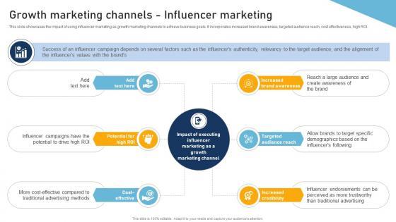 This slide showcases the impact of using influencer marketing as growth marketing channels to achieve business goals. It incorporates increased brand awareness, targeted audience reach, cost effectiveness, high ROI. Retrieve professionally designed A130 A Comprehensive Approach To Growth Growth Marketing Channels Influencer Marketing MKT SS V to effectively convey your message and captivate your listeners. Save time by selecting pre-made slideshows that are appropriate for various topics, from business to educational purposes. These themes come in many different styles, from creative to corporate, and all of them are easily adjustable and can be edited quickly. Access them as PowerPoint templates or as Google Slides themes. You do not have to go on a hunt for the perfect presentation because Slidegeeks got you covered from everywhere. This slide showcases the impact of using influencer marketing as growth marketing channels to achieve business goals. It incorporates increased brand awareness, targeted audience reach, cost effectiveness, high ROI.