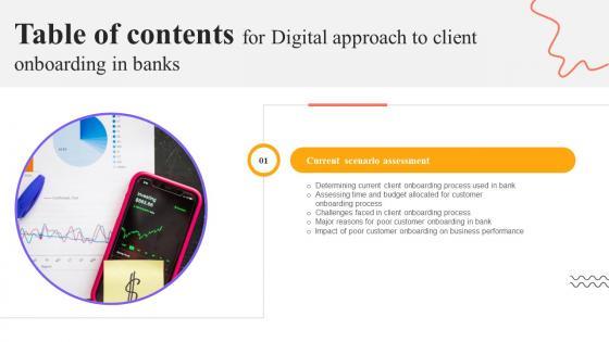 Boost your pitch with our creative Table Of Contents For Digital Approach To Client Onboarding In Banks. Deliver an awe-inspiring pitch that will mesmerize everyone. Using these presentation templates you will surely catch everyones attention. You can browse the ppts collection on our website. We have researchers who are experts at creating the right content for the templates. So you do not have to invest time in any additional work. Just grab the template now and use them. Our Table Of Contents For Digital Approach To Client Onboarding In Banks are topically designed to provide an attractive backdrop to any subject. Use them to look like a presentation pro.