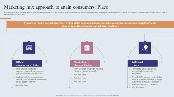 This slide provides information regarding the marketing mix utilized by Amazon to enable competitiveness and international growth. It highlights the venue utilized by firm to reach target audience in terms of official e-commerce websites, physical store, etc. This Marketing Mix Approach To Attain Consumers Place Amazons Journey For Becoming Inspiration PDF from Slidegeeks makes it easy to present information on your topic with precision. It provides customization options, so you can make changes to the colors, design, graphics, or any other component to create a unique layout. It is also available for immediate download, so you can begin using it right away. Slidegeeks has done good research to ensure that you have everything you need to make your presentation stand out. Make a name out there for a brilliant performance. This slide provides information regarding the marketing mix utilized by Amazon to enable competitiveness and international growth. It highlights the venue utilized by firm to reach target audience in terms of official e-commerce websites, physical store, etc.