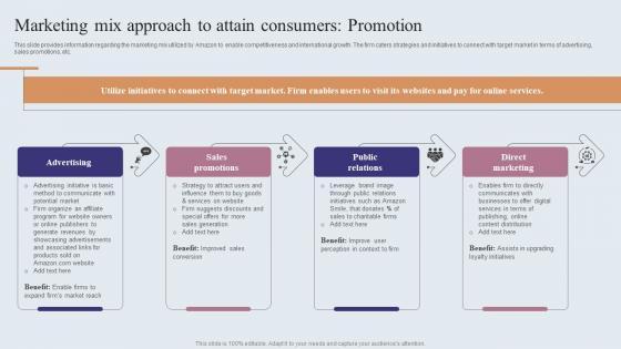 This slide provides information regarding the marketing mix utilized by Amazon to enable competitiveness and international growth. The firm caters strategies and initiatives to connect with target market in terms of advertising, sales promotions, etc. This Marketing Mix Approach To Attain Consumers Promotion Clipart PDF from Slidegeeks makes it easy to present information on your topic with precision. It provides customization options, so you can make changes to the colors, design, graphics, or any other component to create a unique layout. It is also available for immediate download, so you can begin using it right away. Slidegeeks has done good research to ensure that you have everything you need to make your presentation stand out. Make a name out there for a brilliant performance.