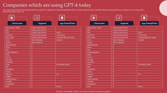 This slide showcases top 50 companies which are using GPT 4 Application Programming Interface API or similar in their products. It provides details about segment and companies such as Harvey, BCG, Microsoft, Monday, Quora, etc. Boost your pitch with our creative Companies Which Are Using GPT 4 Revolutionary Generative AI Innovation Diagrams Pdf. Deliver an awe inspiring pitch that will mesmerize everyone. Using these presentation templates you will surely catch everyones attention. You can browse the ppts collection on our website. We have researchers who are experts at creating the right content for the templates. So you do not have to invest time in any additional work. Just grab the template now and use them. This slide showcases top 50 companies which are using GPT 4 Application Programming Interface API or similar in their products. It provides details about segment and companies such as Harvey, BCG, Microsoft, Monday, Quora, etc.