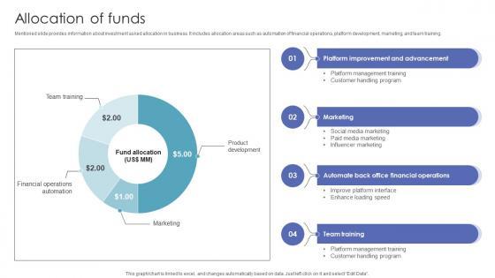 Mentioned slide provides information about investment asked allocation in business. It includes allocation areas such as automation of financial operations, platform development, marketing, and team training.Find a pre-designed and impeccable Allocation Of Funds Investor Funding Pitch Deck For Automated Ar Platform. The templates can ace your presentation without additional effort. You can download these easy-to-edit presentation templates to make your presentation stand out from others. So, what are you waiting for Download the template from Slidegeeks today and give a unique touch to your presentation. Mentioned slide provides information about investment asked allocation in business. It includes allocation areas such as automation of financial operations, platform development, marketing, and team training.