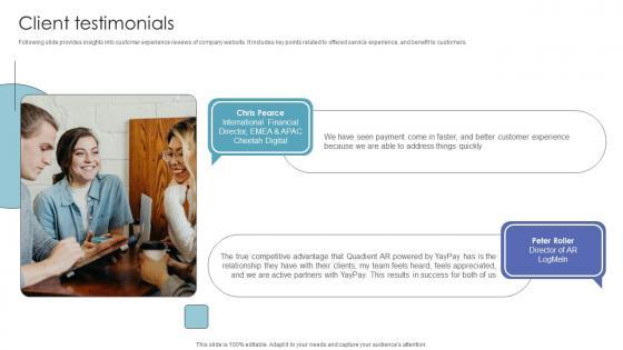 Following slide provides insights into customer experience reviews of company website. It includes key points related to offered service experience, and benefit to customers.Create an editable Client Testimonials Investor Funding Pitch Deck For Automated Ar Platform that communicates your idea and engages your audience. Whether you are presenting a business or an educational presentation, pre-designed presentation templates help save time. Client Testimonials Investor Funding Pitch Deck For Automated Ar Platform is highly customizable and very easy to edit, covering many different styles from creative to business presentations. Slidegeeks has creative team members who have crafted amazing templates. So, go and get them without any delay. Following slide provides insights into customer experience reviews of company website. It includes key points related to offered service experience, and benefit to customers.