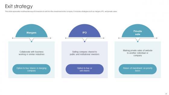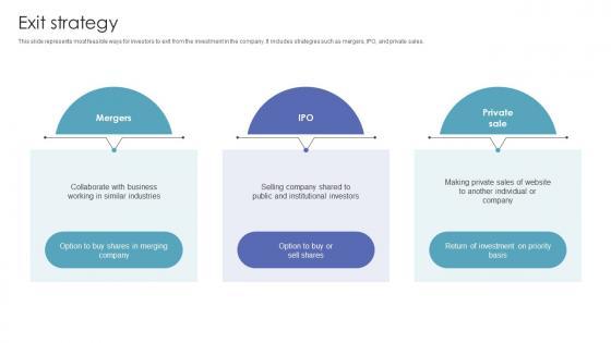 This slide represents most feasible ways for investors to exit from the investment in the company. It includes strategies such as mergers, IPO, and private sales.From laying roadmaps to briefing everything in detail, our templates are perfect for you. You can set the stage with your presentation slides. All you have to do is download these easy-to-edit and customizable templates. Exit Strategy Investor Funding Pitch Deck For Automated Ar Platform will help you deliver an outstanding performance that everyone would remember and praise you for. Do download this presentation today. This slide represents most feasible ways for investors to exit from the investment in the company. It includes strategies such as mergers, IPO, and private sales.
