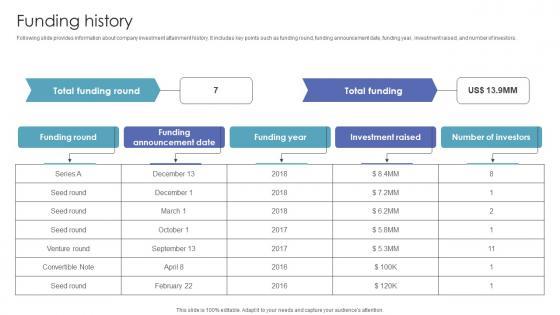 Following slide provides information about company investment attainment history. It includes key points such as funding round, funding announcement date, funding year, investment raised, and number of investors.Do you have an important presentation coming up Are you looking for something that will make your presentation stand out from the rest Look no further than Funding History Investor Funding Pitch Deck For Automated Ar Platform. With our professional designs, you can trust that your presentation will pop and make delivering it a smooth process. And with Slidegeeks, you can trust that your presentation will be unique and memorable. So why wait Grab Funding History Investor Funding Pitch Deck For Automated Ar Platform today and make your presentation stand out from the rest Following slide provides information about company investment attainment history. It includes key points such as funding round, funding announcement date, funding year, investment raised, and number of investors.
