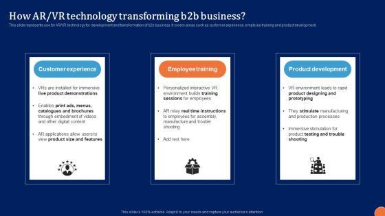 This slide represents use for AR VR technology for development and transformation of b2b business. It covers areas such as customer experience, employee training and product development. Welcome to our selection of the How AR VR Technology Transforming Digital Platform Administration For B2B Ecommerce Graphics Pdf. These are designed to help you showcase your creativity and bring your sphere to life. Planning and Innovation are essential for any business that is just starting out. This collection contains the designs that you need for your everyday presentations. All of our PowerPoints are 100 percent editable, so you can customize them to suit your needs. This multi purpose template can be used in various situations. Grab these presentation templates today This slide represents use for AR VR technology for development and transformation of b2b business. It covers areas such as customer experience, employee training and product development.