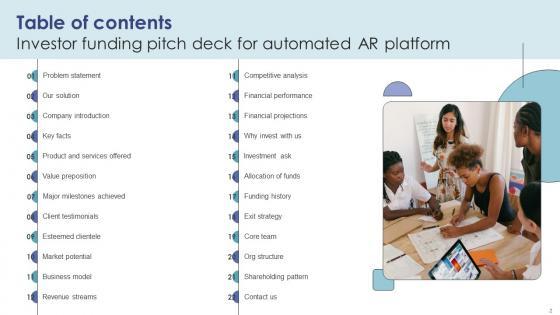 Welcome to our selection of the Table Of Contents Investor Funding Pitch Deck For Automated Ar Platform. These are designed to help you showcase your creativity and bring your sphere to life. Planning and Innovation are essential for any business that is just starting out. This collection contains the designs that you need for your everyday presentations. All of our PowerPoints are 100 percent editable, so you can customize them to suit your needs. This multi-purpose template can be used in various situations. Grab these presentation templates today. Our Table Of Contents Investor Funding Pitch Deck For Automated Ar Platform are topically designed to provide an attractive backdrop to any subject. Use them to look like a presentation pro.