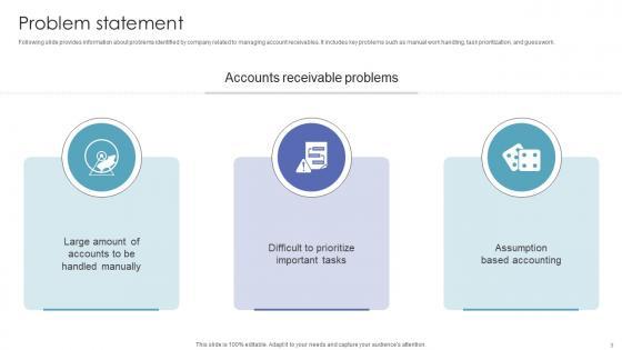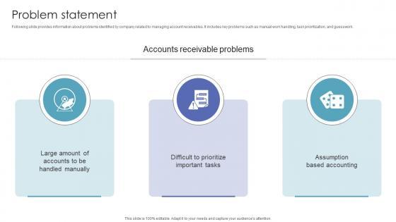 Following slide provides information about problems identified by company related to managing account receivables. It includes key problems such as manual work handling, task prioritization, and guesswork.Formulating a presentation can take up a lot of effort and time, so the content and message should always be the primary focus. The visuals of the PowerPoint can enhance the presenters message, so our Problem Statement Investor Funding Pitch Deck For Automated Ar Platform was created to help save time. Instead of worrying about the design, the presenter can concentrate on the message while our designers work on creating the ideal templates for whatever situation is needed. Slidegeeks has experts for everything from amazing designs to valuable content, we have put everything into Problem Statement Investor Funding Pitch Deck For Automated Ar Platform. Following slide provides information about problems identified by company related to managing account receivables. It includes key problems such as manual work handling, task prioritization, and guesswork.