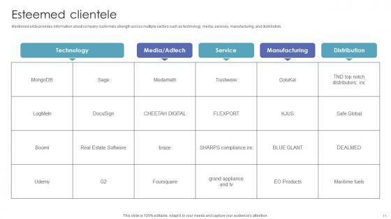Mentioned slide provides information about company customers strength across multiple sectors such as technology, media, services, manufacturing, and distribution.Get a simple yet stunning designed Esteemed Clientele Investor Funding Pitch Deck For Automated Ar Platform. It is the best one to establish the tone in your meetings. It is an excellent way to make your presentations highly effective. So, download this PPT today from Slidegeeks and see the positive impacts. Our easy-to-edit Esteemed Clientele Investor Funding Pitch Deck For Automated Ar Platform can be your go-to option for all upcoming conferences and meetings. So, what are you waiting for Grab this template today. Mentioned slide provides information about company customers strength across multiple sectors such as technology, media, services, manufacturing, and distribution.