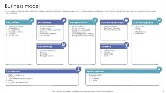 Following slide provided detailed insights into companies business model which comprises of key partners, key activities, resources, value proposition, customer relations, channels, customer segment, cost structure and revenue sources.Boost your pitch with our creative Business Model Investor Funding Pitch Deck For Automated Ar Platform. Deliver an awe-inspiring pitch that will mesmerize everyone. Using these presentation templates you will surely catch everyones attention. You can browse the ppts collection on our website. We have researchers who are experts at creating the right content for the templates. So you do not have to invest time in any additional work. Just grab the template now and use them. Following slide provided detailed insights into companies business model which comprises of key partners, key activities, resources, value proposition, customer relations, channels, customer segment, cost structure and revenue sources.