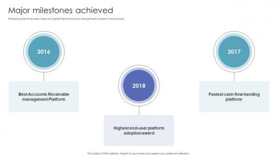 Following slide showcases major accomplishment of accounts management company in recent years.If you are looking for a format to display your unique thoughts, then the professionally designed Major Milestones Achieved Investor Funding Pitch Deck For Automated Ar Platform is the one for you. You can use it as a Google Slides template or a PowerPoint template. Incorporate impressive visuals, symbols, images, and other charts. Modify or reorganize the text boxes as you desire. Experiment with shade schemes and font pairings. Alter, share or cooperate with other people on your work. Download Major Milestones Achieved Investor Funding Pitch Deck For Automated Ar Platform and find out how to give a successful presentation. Present a perfect display to your team and make your presentation unforgettable. Following slide showcases major accomplishment of accounts management company in recent years.