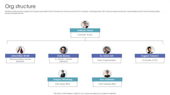 Mentioned slide provides insights into company organisation chart. It includes key members such as CEO, co founder, marketing director, SR. customer experience director, implementation head, Chief Technology officer, product management, etc.Crafting an eye-catching presentation has never been more straightforward. Let your presentation shine with this tasteful yet straightforward Org Structure Investor Funding Pitch Deck For Automated Ar Platform template. It offers a minimalistic and classy look that is great for making a statement. The colors have been employed intelligently to add a bit of playfulness while still remaining professional. Construct the ideal Org Structure Investor Funding Pitch Deck For Automated Ar Platform that effortlessly grabs the attention of your audience Begin now and be certain to wow your customers Mentioned slide provides insights into company organisation chart. It includes key members such as CEO, co founder, marketing director, SR. customer experience director, implementation head, Chief Technology officer, product management, etc.