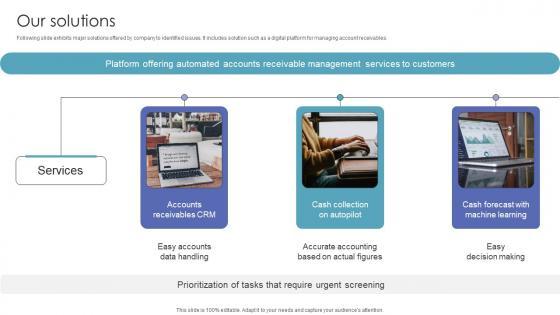 Following slide exhibits major solutions offered by company to identified issues. It includes solution such as a digital platform for managing account receivables.Make sure to capture your audiences attention in your business displays with our gratis customizable Our Solutions Investor Funding Pitch Deck For Automated Ar Platform. These are great for business strategies, office conferences, capital raising or task suggestions. If you desire to acquire more customers for your tech business and ensure they stay satisfied, create your own sales presentation with these plain slides. Following slide exhibits major solutions offered by company to identified issues. It includes solution such as a digital platform for managing account receivables.