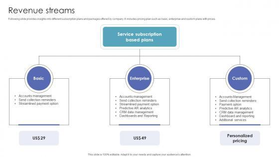 Following slide provides insights into different subscription plans and packages offered by company. It includes pricing plan such as basic, enterprise and custom plans with prices.This modern and well-arranged Revenue Streams Investor Funding Pitch Deck For Automated Ar Platform provides lots of creative possibilities. It is very simple to customize and edit with the Powerpoint Software. Just drag and drop your pictures into the shapes. All facets of this template can be edited with Powerpoint, no extra software is necessary. Add your own material, put your images in the places assigned for them, adjust the colors, and then you can show your slides to the world, with an animated slide included. Following slide provides insights into different subscription plans and packages offered by company. It includes pricing plan such as basic, enterprise and custom plans with prices.
