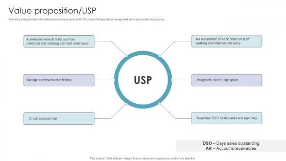 Following slide provides information about unique services AR Accounts Receivables management services provides by company. Explore a selection of the finest Value Proposition USP Investor Funding Pitch Deck For Automated Ar Platform here. With a plethora of professionally designed and pre-made slide templates, you can quickly and easily find the right one for your upcoming presentation. You can use our Value Proposition USP Investor Funding Pitch Deck For Automated Ar Platform to effectively convey your message to a wider audience. Slidegeeks has done a lot of research before preparing these presentation templates. The content can be personalized and the slides are highly editable. Grab templates today from Slidegeeks. Following slide provides information about unique services AR Accounts Receivables management services provides by company.