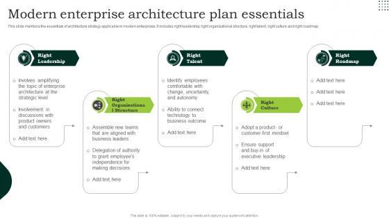 This slide mentions the essentials of architecture strategy applicable in modern enterprises. It includes right leadership, right organizational structure, right talent, right culture and right roadmap. Showcasing this set of slides titled Modern Enterprise Architecture Plan Essentials Template Pdf. The topics addressed in these templates are Right Leadership, Right Talent, Right Culture. All the content presented in this PPT design is completely editable. Download it and make adjustments in color, background, font etc. as per your unique business setting. This slide mentions the essentials of architecture strategy applicable in modern enterprises. It includes right leadership, right organizational structure, right talent, right culture and right roadmap.