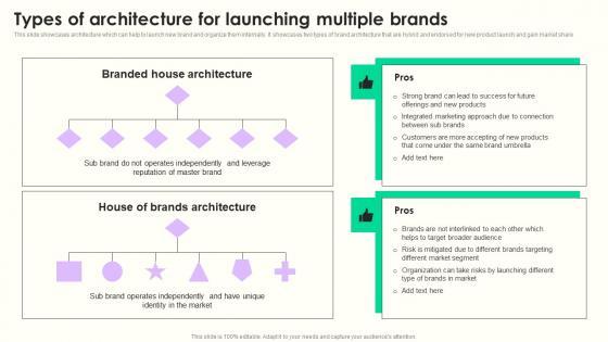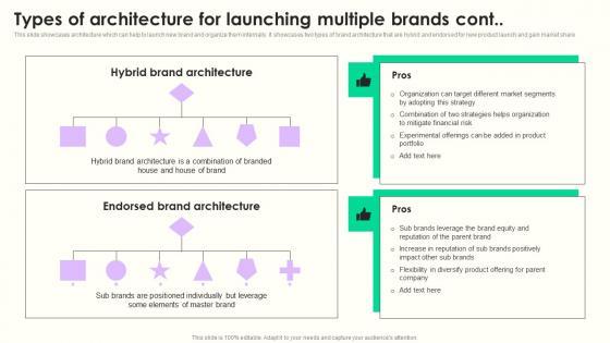 This slide showcases architecture which can help to launch new brand and organize them internally. It showcases two types of brand architecture that are hybrid and endorsed for new product launch and gain market share Are you in need of a template that can accommodate all of your creative concepts This one is crafted professionally and can be altered to fit any style. Use it with Google Slides or PowerPoint. Include striking photographs, symbols, depictions, and other visuals. Fill, move around, or remove text boxes as desired. Test out color palettes and font mixtures. Edit and save your work, or work with colleagues. Download Types Of Architecture Launching Maximizing Sales Via Online Brand Marketing Strategies Template Pdf and observe how to make your presentation outstanding. Give an impeccable presentation to your group and make your presentation unforgettable. This slide showcases architecture which can help to launch new brand and organize them internally. It showcases two types of brand architecture that are hybrid and endorsed for new product launch and gain market share