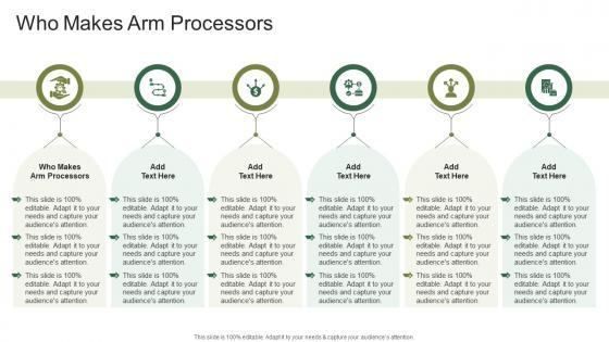 Presenting our innovatively designed set of slides titled Who Makes Arm Processors In Powerpoint And Google Slides Cpb. This completely editable PowerPoint graphic exhibits Who Makes Arm Processors that will help you convey the message impactfully. It can be accessed with Google Slides and is available in both standard screen and widescreen aspect ratios. Apart from this, you can download this well structured PowerPoint template design in different formats like PDF, JPG, and PNG. So, click the download button now to gain full access to this PPT design. Our Who Makes Arm Processors In Powerpoint And Google Slides Cpb are topically designed to provide an attractive backdrop to any subject. Use them to look like a presentation pro.