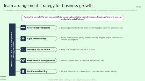 The following slide showcases example of business growth by using team arrangement strategies. It showcases strategies such as cross functional teams, agile methodology, diversity and inclusion, flexible work arrangements and continuous learning. Do you know about Slidesgeeks Designing Strategies For Company Growth And Success Team Arrangement Strategy For Business Growth Template PDF. These are perfect for delivering any kind od presentation. Using it, create PowerPoint presentations that communicate your ideas and engage audiences. Save time and effort by using our pre designed presentation templates that are perfect for a wide range of topic. Our vast selection of designs covers a range of styles, from creative to business, and are all highly customizable and easy to edit. Download as a PowerPoint template or use them as Google Slides themes.