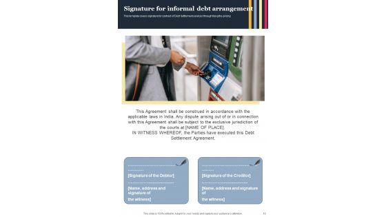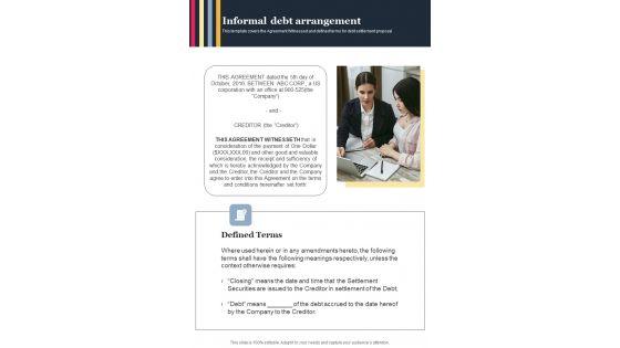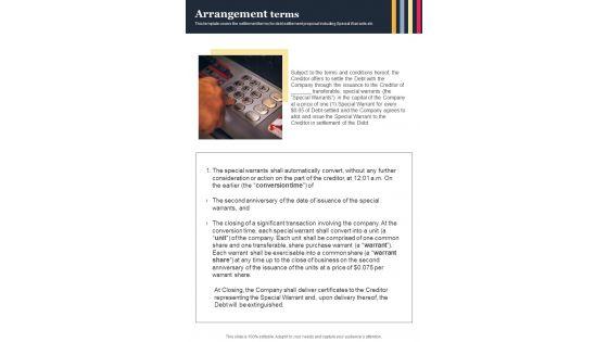 Presenting you an exemplary Arrangement Terms Informal Debt Arrangement One Pager Sample Example Document. Our one-pager comprises all the must-have essentials of an inclusive document. You can edit it with ease, as its layout is completely editable. With such freedom, you can tweak its design and other elements to your requirements. Download this Arrangement Terms Informal Debt Arrangement One Pager Sample Example Document brilliant piece now. Our Arrangement Terms Informal Debt Arrangement One Pager Sample Example Document are topically designed to provide an attractive backdrop to any subject. Use them to look like a presentation pro.