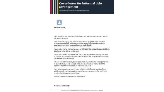 Presenting you an exemplary Cover Letter For Informal Debt Arrangement One Pager Sample Example Document. Our one-pager comprises all the must-have essentials of an inclusive document. You can edit it with ease, as its layout is completely editable. With such freedom, you can tweak its design and other elements to your requirements. Download this Cover Letter For Informal Debt Arrangement One Pager Sample Example Document brilliant piece now. Our Cover Letter For Informal Debt Arrangement One Pager Sample Example Document are topically designed to provide an attractive backdrop to any subject. Use them to look like a presentation pro.