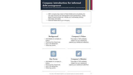 Presenting you an exemplary Company Introduction For Informal Debt Arrangement One Pager Sample Example Document. Our one-pager comprises all the must-have essentials of an inclusive document. You can edit it with ease, as its layout is completely editable. With such freedom, you can tweak its design and other elements to your requirements. Download this Company Introduction For Informal Debt Arrangement One Pager Sample Example Document brilliant piece now. Our Company Introduction For Informal Debt Arrangement One Pager Sample Example Document are topically designed to provide an attractive backdrop to any subject. Use them to look like a presentation pro.